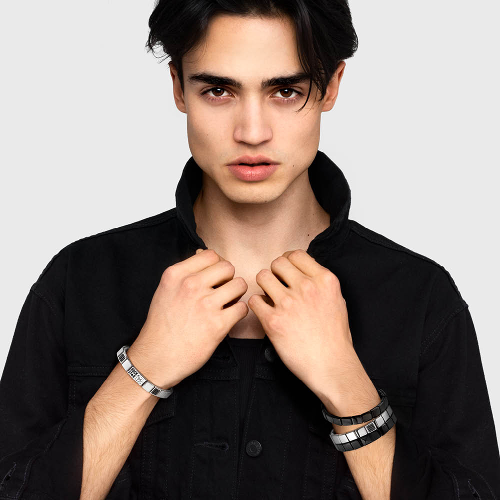The Gold Jewelry Collection is crafted from gold-tone, white gold-tone and rose gold-tone stainless steel in sculptural style. In addition to stackable bracelets and bangles, the collection also features chains and rings.