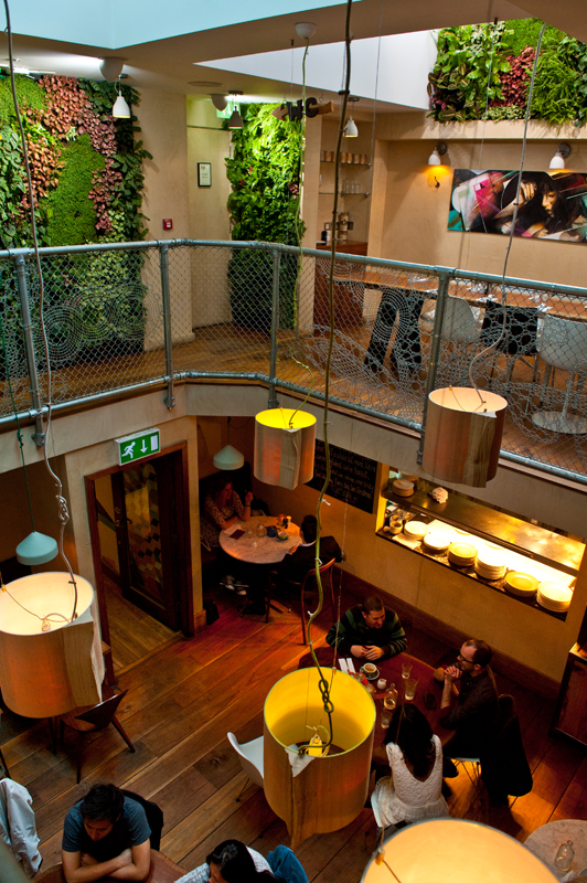 Serving cuisine with a global influence, the standards of service are uncompromising, with a highly developed sense of noblesse oblige, each and every customer is valued as a welcome friend by Massimo, the front-of-house manager. The light streams in through a roof window onto a vibrant wall of foliage creating the perfect backdrop to the non-conformist tables and chairs, different styles and textures, refreshingly breaking up the dining area with slices of beautifully turned wood and marble… there were no ‘bad tables’.