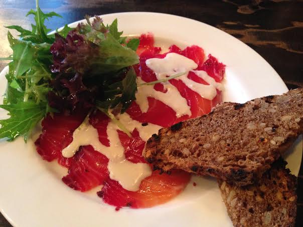 We start with a Burrata with basil oil, chilli flakes and sourdough bread and Beetroot and also Vodka cured salmon with rye bread and horseradish cream. Both are great. I love my vodka cured salmon, it tastes great and the horseradish cream and rye bread are both top-notch and work well together. The Burrata is also great and works well with the other ingredients. We thought it should have come on a bigger plate but other than that: we had no complaints. We also have some cocktails, they are a little watery but the food makes up for it.