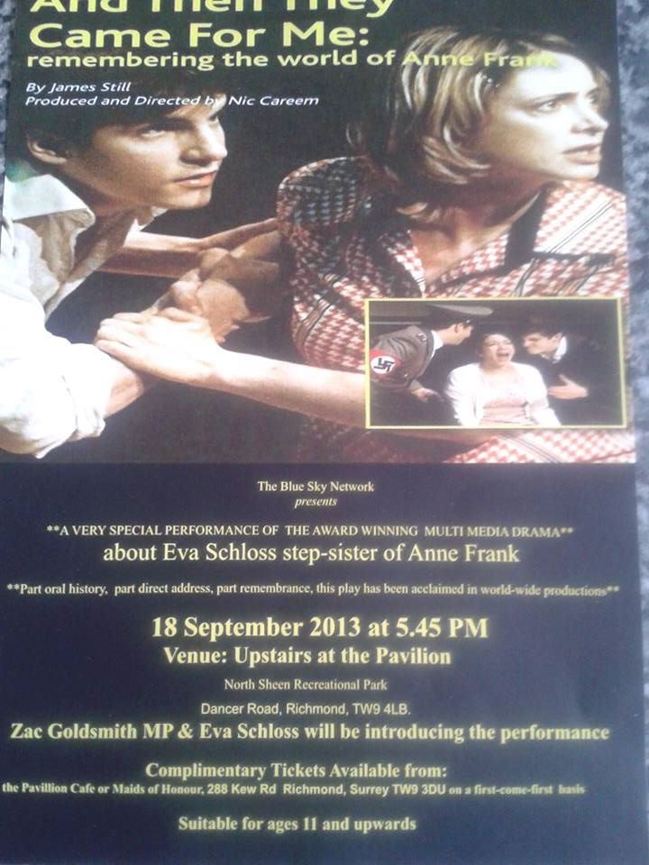 On the 18th of September, Nic Careem, the owner and founder of the Blue Sky Network, will have another performance of his acclaimed play; And Then They Came For Me. Richmond MP Zac Goldsmith will be joined by the Mayor of Richmond to introduce the Eva Schloss/Anne Frank play next Wednesday (18th) in Kew. There are a few complimentary tickets for Richmond, Kew and Kingston citizens.