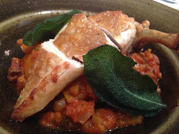 For mains Marcin had the Baked salmon, heritage beets, broad beans and horseradish cream which he said was excellent: tender on the inside and slightly crispy on the outside. Paloma had the Spiced Newlyn Bay crab macaroni cheese. She said it was slightly a let down and overshadowed by chilli. James had a Spicy pork & fennel, plum tomatoes, buffalo mozzarella, basil & fresh chilli pizza which was excellent. James thought it was perfectly spicy. I had the Pan fried Label Anglaise free range chicken breast with smoked pancetta, roast squash, Italian beans in a rich tomato ragu: this dish was amazing. The best one I think. It was comfort food but even better. The sauce was amazing and the chicken was perfectly done.