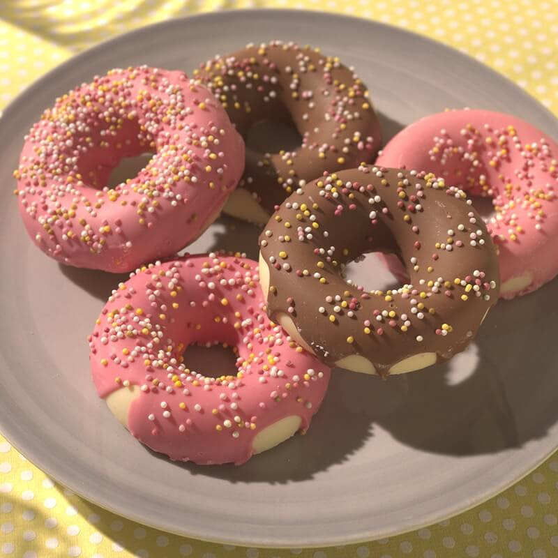 Dive into these tasty treats the Chocolate Doughnuts are made from 100% solid white and milk Belgian chocolate and crafted carefully to look like an iced doughnut, the decoration adds an extra delight with hundreds and thousands.