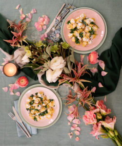 To create a romantic setting place flowers in a diagonal line along the table, you can also gently place a table runner or a soft coloured fabric underneath the flowers and use flower petals to frame the composition. The fabric will work best if it’s a contrasting colour to the flowers, allowing them to stand out. A linen tablecloth in a light grey palette balances the candy pink and pastel green plates, with mismatched napkins for a fun touch. As a final romantic touch, light an unscented candle to give a soft touch of light and serve a delicious plate of your partner’s favourite La Famiglia Rana pasta. Happy Valentine’s Day and… buon appetito!