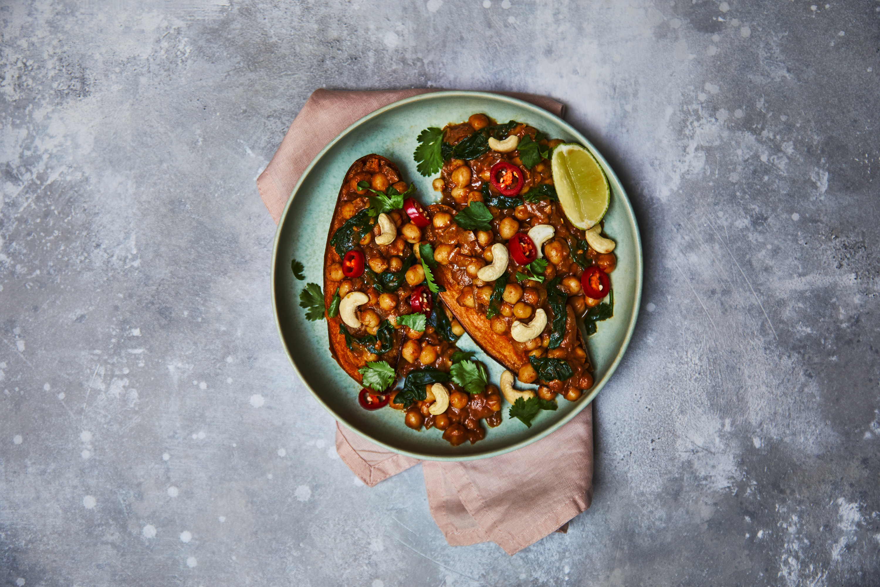 Step 10: Cut the sweet potatoes in half, lengthways, and fill with the chickpea curry. Garnish with the chilli rounds, chopped coriander, toasted cashew nuts and a lime wedge – bosh!
