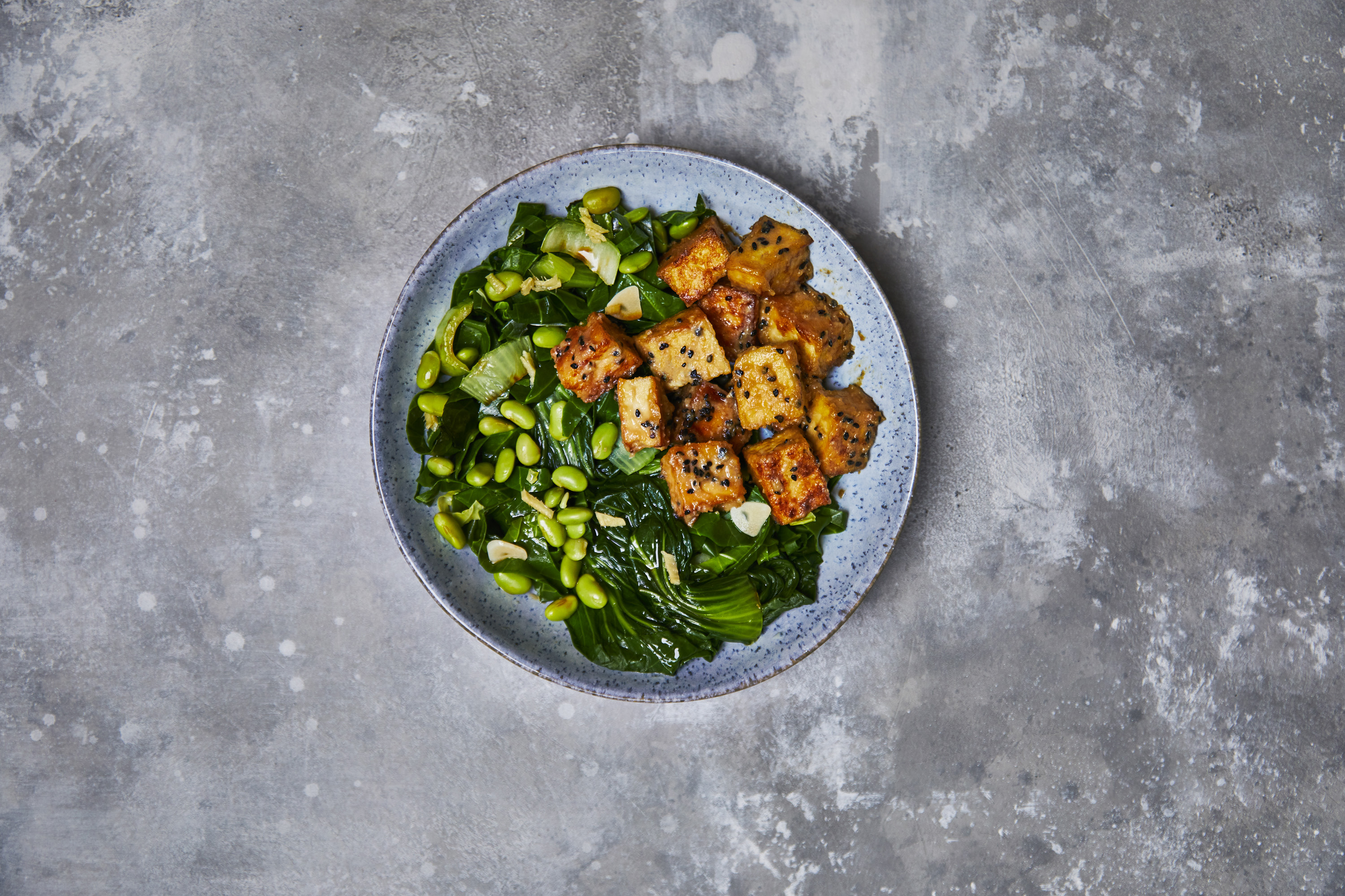 Step 12: Sprinkle over the black sesame seeds and serve the miso tofu with the stir-fried ginger greens to the side. Get in!